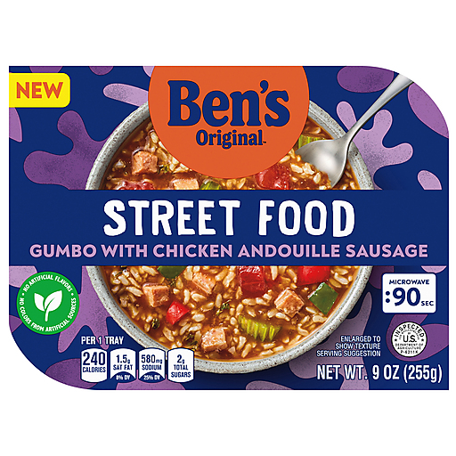 When you're craving a tasty and exciting entrée but don't want to cook, our Street Food bowls have got you covered. BEN'S ORIGINAL™ Street Food Gumbo with Chicken Andouille Sausage brings you a comforting gumbo stew with zesty chicken andouille sausage, long grain brown rice, and vegetables. Ready in just 90 seconds from the microwave, this Street Food dish is bursting with mouthwatering flavor from carefully chosen ingredients, including tomatoes, celery, okra, and red and green bell peppers. This prepared entrée is great for an instant lunch, a quick dinner, or to pack for the office. No refrigeration is needed – just heat and serve! Explore the additional Street Food flavors to give your tastebuds what they crave.