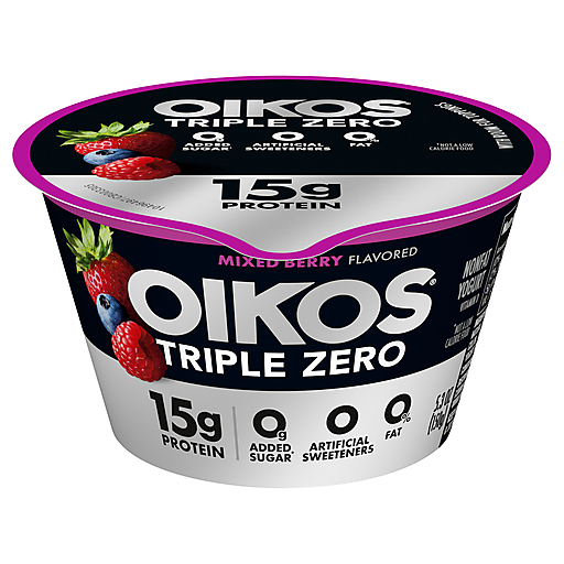 Enjoy epic tastes with Oikos Triple Zero Nonfat Mixed Berry Greek Yogurt, the delicious nonfat Greek yogurt cup with more of what you want and less of what you don’t. Each Oikos Triple Zero yogurt cup contains 0% fat, 0g added sugar* per 5.3 oz serving and 0 artificial sweeteners. Our mixed berry flavored Greek yogurt packs a punch with 15 grams of protein, so you can always have dependable, high protein snacks with zero holding you back. Because when you feel strong, you are unstoppable. With protein and deliciousness, this Greek nonfat yogurt can help you strive to reach your potential with every serving. Protein is important - an essential nutrient that we need in our diet - and Oikos Triple Zero cups are great tasting, convenient solutions for adding complete protein every day. Pack a Greek nonfat yogurt cup for days that start at a sprint and enjoy a delicious boost of protein at lunch. Or throw in your favorite fruit or toppings for an extra refreshing snack. For even more reasons to go Greek, try Oikos Pro snack cups with 20g of protein per serving or Oikos Blended with chunks of real fruit. Oikos Greek yogurt — Stronger Makes Everything Better (R). *Not a low-calorie food.
