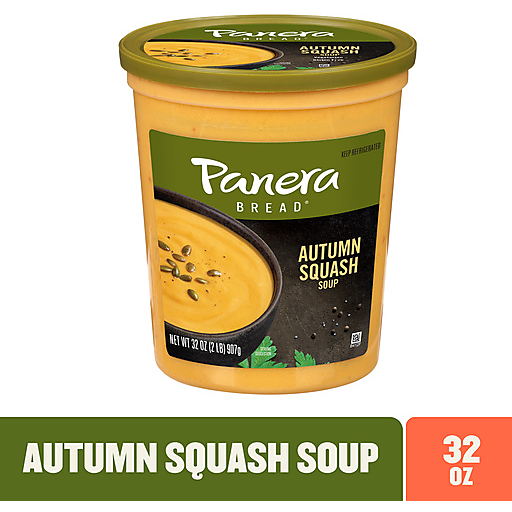 Panera Autumn Squash Soup delivers a bakery-cafe inspired favorite in a microwavable cup that you can take with you on-the-go. This soup is made with pumpkin and butternut squash blended with ginger, warm spices and a hint of sweet apple. Whether you have a busy day and need a quick meal or you just want to enjoy a warm cup of soup, this Panera soup is perfect for any time of day. To cook this Panera Autumn Squash Soup, remove the lid and film and place in the microwave, covering loosely. Heat this microwave soup cup on high for five to six minutes and stir halfway through. You can also cook this vegetarian soup on the stove top to 165 degrees F, but do not boil. Store this creamy soup cup in the refrigerator or freezer until you are ready to prepare. Make easy, craveable meals with help from Panera Bread at home.