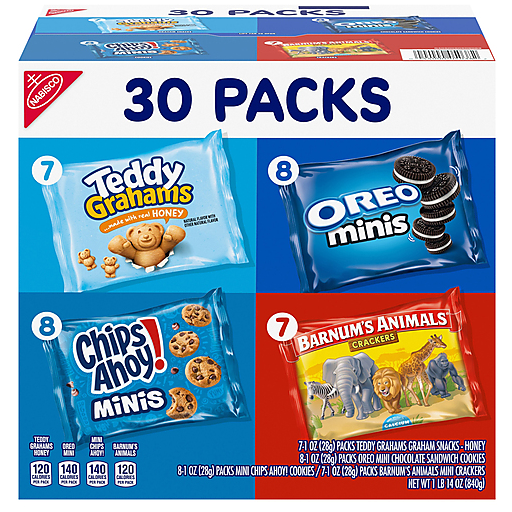 This Nabisco Team Favorites Snacks Variety Pack includes CHIPS AHOY! Mini, OREO Mini cookies, Teddy Grahams Honey and Barnum's Animal Crackers, to give you all your favorite flavors in convenient snack packs. These treats are bite-size versions of classic snacks, great for on-the-go nibbling or afternoon snacking. OREO Mini cookies bring a tiny twist to the chocolate sandwich cookies you already know, and CHIPS AHOY! Mini chocolate chip cookies deliver a classic chocolate chip flavor in an adorable bite-size snack. Barnum's Animal Crackers and Teddy Grahams Honey snack crackers provide just the right touch of sweetness to brighten your day. Grab this team-sized box next time you're on snack duty for a big game or tuck a bag of these individual snacks into a office or school lunchbox for an afternoon treat. This bulk box of on the go snacks includes 30 individual packages for convenient storage and easy packing.